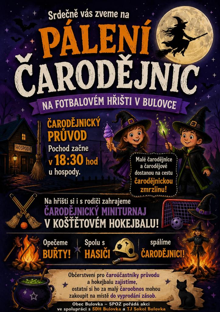 Zveme vás na kouzelný podvečer na fotbalovém hřišti v Bulovce! Čarodějnický průvod vyrazí v 18:30 od hospody, na děti čeká sladká odměna.