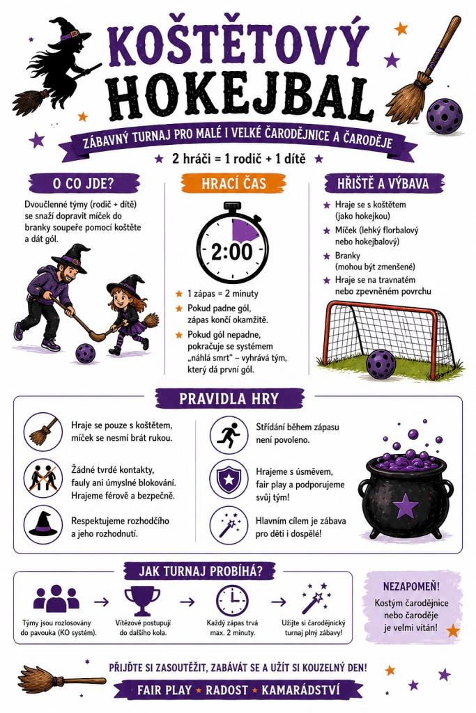 Těšit se můžete na miniturnaj v košťatovém hokejbalu pro děti i rodiče, opékání buřtů i společné pálení čarodějnice s hasiči.