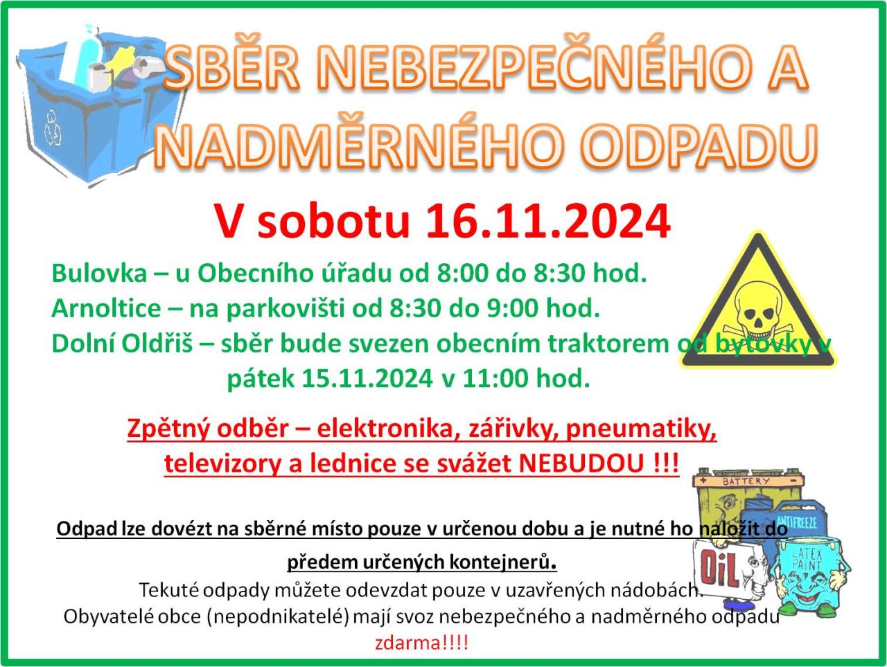 Svoz nebezpečného a nadměrného odpadu proběhne v sobotu 16. listopadu .... Bulovka OÚ 8 - 8:30hod, Arnoltice 8:30 - 9:00hod, Dolní Oldřiš - odpad bude svezen v pátek 15/11/2024 v 11 hod.