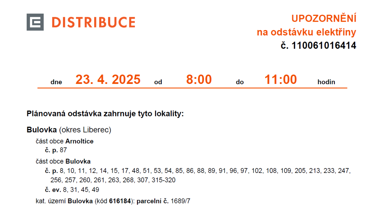 UPOZORNĚNÍ na odstávku elektřiny 23.4.2025