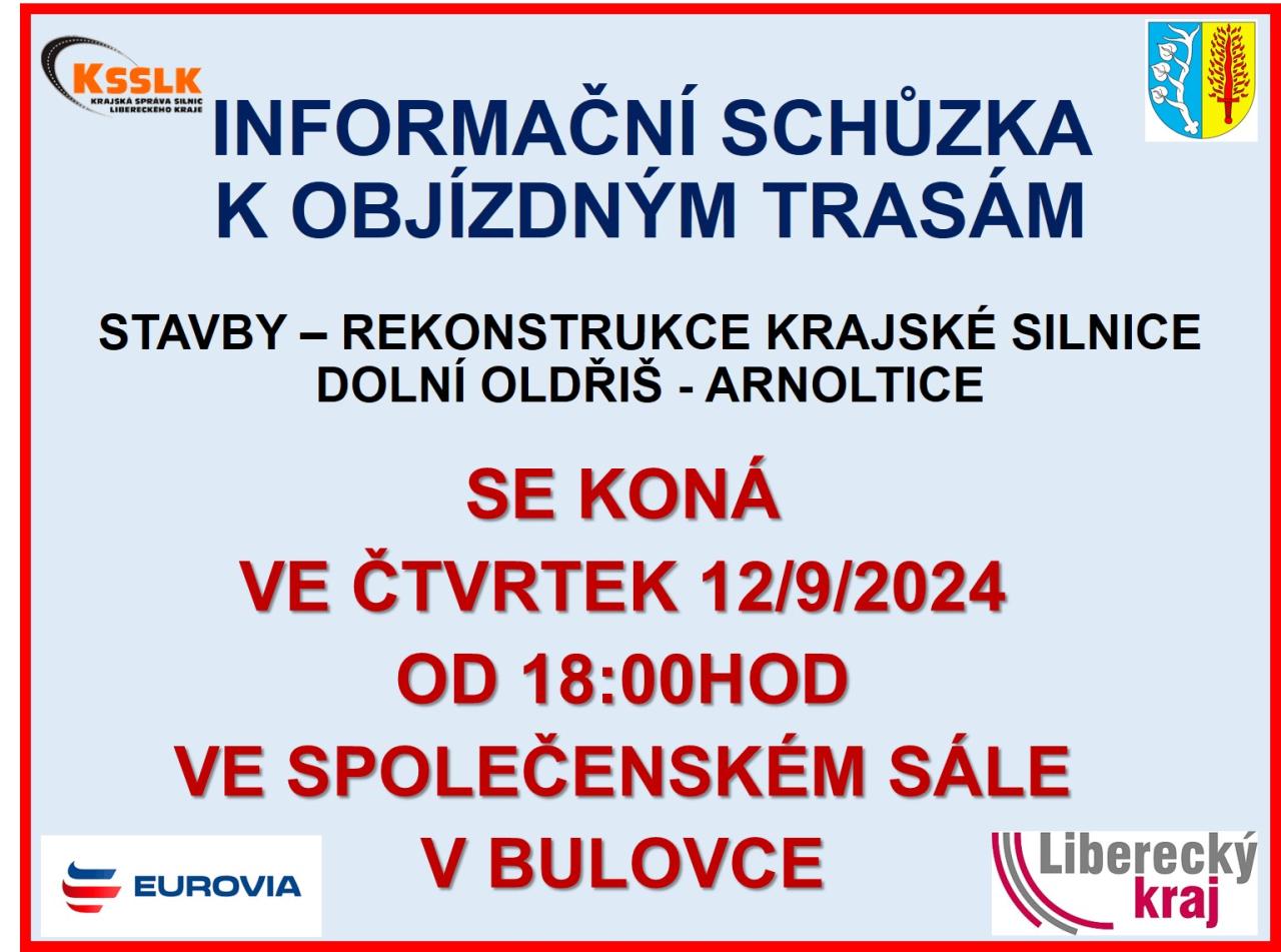 INFORMAČNÍ SCHŮZKA K OBJÍZDNÝM TRASÁM STAVBY – REKONSTRUKCE KRAJSKÉ SILNICE DOLNÍ OLDŘIŠ - ARNOLTICE SE KONÁ VE ČTVRTEK 12/9/2024 OD 18:00HOD VE SPOLEČENSKÉM SÁLE V BULOVCE.