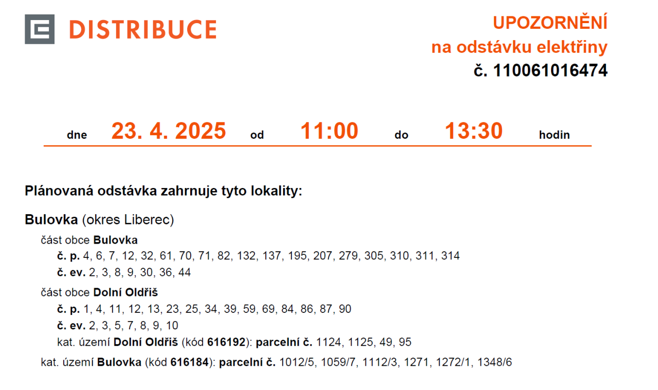UPOZORNĚNÍ na odstávku elektřiny 23.4.2025