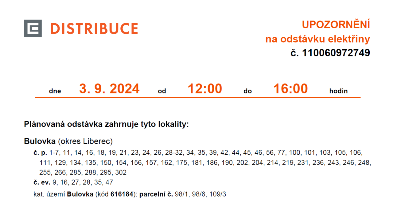 Upozornění na odstávku elektřiny v Bulovce 3.9.2024 od 12 do 16 hodin