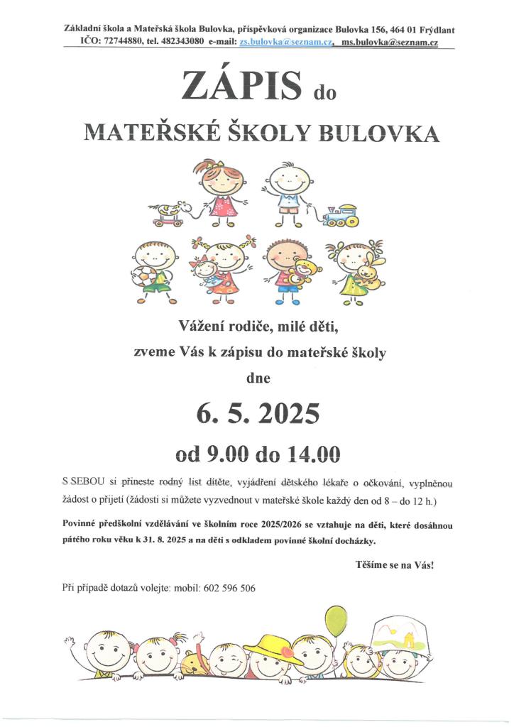 Zápis do Mateřské školy Bulovka proběhne v úterý 6. května od 9:00 do 14:00 hod. Těšíme se na Vás. :-)